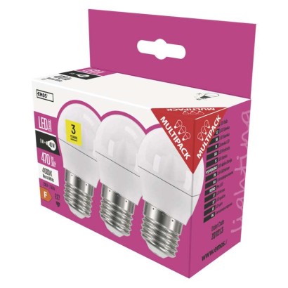 barva světla: neutrální bílá|energetická třída (od 1.9.2021): F|index podání barev (CRI): 80|náhrada za žárovku: 40 W|napětí: 230 V~/50 Hz|patice (uchycení žárovky): E27|počet čipů: 8|počet spínacích cyklů: 25 000|příkon: 5 W|prodejní obal: 3 ks, krabička|řada: CLASSIC|rozměr: 45 × 74 mm|stmívatelná: ne|světelná účinnost: 78 lm/W|světelný tok: 470 lm|technologie: LED|teplota chromatičnosti: 4 000 K|tvar: Mini Globe|typ čipů: 2835|účiník: 0,5|úhel vyzařování: 220°|záruční doba: 3 roky|životnost: 30 000 hodin