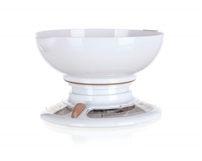 Mechanická kuchyňská váha CULINARIA WHITE 3 kg, vyrobená z plastu PP, objem mísy 1250 ml. Váživost 3 kg, rozlišení 25 g.