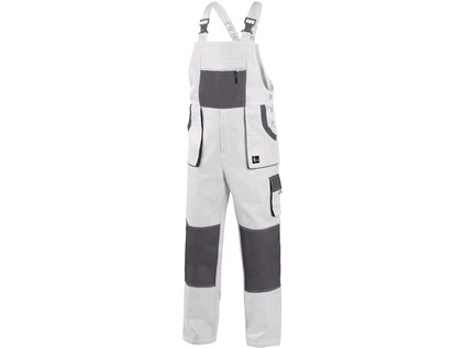 Pánské montérkové kalhoty s náprsenkou, náprsní kapsa na zip, pas vzadu do gumy, přední kapsy, boční kapsa na svinovací / skládací metr, boční kapsa na mobil / peněženku, zdvojená kolena, zadní kapsa s klopou, šle s gumou vzadu, reflexní doplňky.