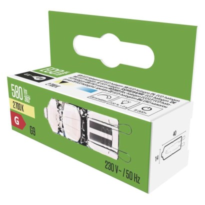 barva světla: teplá bílá|energetická třída (od 1.9.2021): G|index podání barev (CRI): 99,9|náhrada za žárovku: 47 W|napětí: 230 V~/50 Hz|patice (uchycení žárovky): G9|počet čipů: neuvádí se|počet spínacích cyklů: 8 000|příkon: 45 W|prodejní obal: 1 ks, krabička|řada: HALOGEN|rozměr: 40 × 14 × 14 mm|stmívatelná: ne|světelná účinnost: 13 lm/W|světelný tok: 580 lm|technologie: halogen|teplota chromatičnosti: 2 700 K|tvar: JC|typ čipů: neuvádí se|účiník: neuvádí se|úhel vyzařování: 270°|záruční doba: 2 roky|životnost: 2 000 hodin