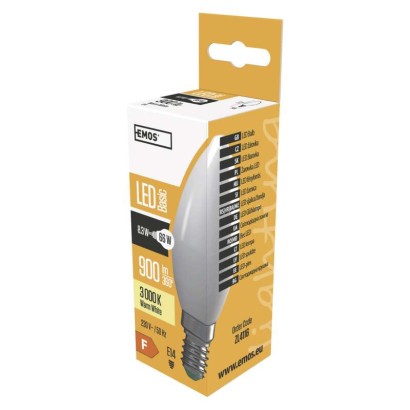 barva světla: teplá bílá|energetická třída (od 1.9.2021): F|index podání barev (CRI): 80|náhrada za žárovku: 66 W|napětí: 230 V~/50 Hz|patice (uchycení žárovky): E14|počet čipů: neuvádí se|počet spínacích cyklů: 15 000|příkon: 8,3 W|prodejní obal: 1 ks, krabička|řada: BASIC|rozměr: 112 × 38 × 38 mm|stmívatelná: ne|světelná účinnost: 108 lm/W|světelný tok: 900 lm|technologie: LED|teplota chromatičnosti: 3 000 K|tvar: Candle|typ čipů: SMD|účiník: 0,55|úhel vyzařování: 220°|záruční doba: 2 roky|životnost: 20 000 hodin
