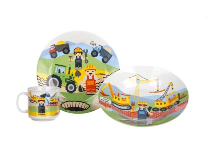 Dětská 3dílná sada THE BUILDERS je složena z hlubokého a mělkého talíře o průměru 20 cm, hrnečku o objemu 210 ml. Sada je vyrobena z keramiky s dekorem stavitelé.