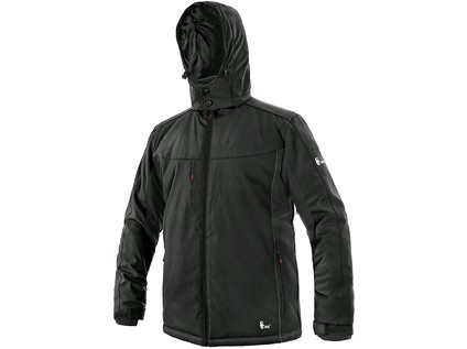 Pánská zateplená softshellová bunda, odolná proti vodě a větru, větrání v podpaží, odepínací kapuce, regulovatelná manžeta na rukávech a pružná manžeta v rukávech, stahování v dolním okraji, černé reflexní výpustky, TPU membrána, odolnost materiálu p