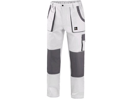 Pánské montérkové kalhoty, pas s poutky na opasek, vzadu do gumy, přední kapsy, boční kapsa na svinovací / skládací metr, boční kapsa na mobil / peněženku, zdvojená kolena, zadní kapsa s klopou, reflexní doplňky.