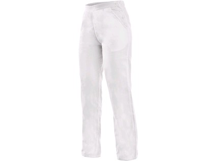 Dámské kalhoty, pevný pas, boční zapínání na knoflíky, v zadní části poutka s knoflíky na stáhnutí.