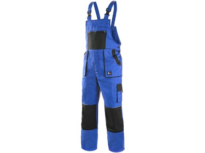 Pánské montérkové kalhoty s náprsenkou - zkrácená varianta na výšku 170-176 cm. Náprsní kapsa na zip, pas vzadu do gumy, přední kapsy, boční kapsa na svinovací / skládací metr, boční kapsa na mobil / peněženku, zdvojená kolena, zadní kapsa s klopou,