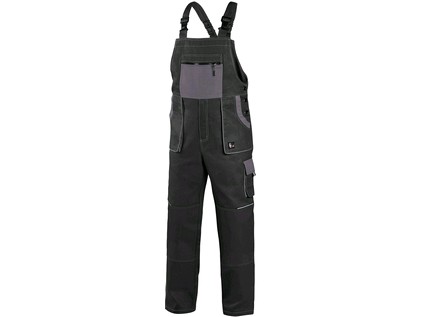 Pánské montérkové kalhoty s náprsenkou, náprsní kapsa na zip, pas vzadu do gumy, přední kapsy, boční kapsa na svinovací / skládací metr, boční kapsa na mobil / peněženku, zdvojená kolena, zadní kapsa s klopou, šle s gumou vzadu, reflexní doplňky.
