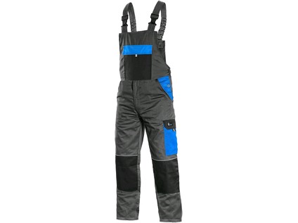 Pánské montérkové kalhoty s náprsenkou, náprsní kapsa s klopou, přední klínové kapsy, kapsa na skládací/svinovací metr, boční kapsa s klopou, zadní jednoduchá kapsa, zdvojená kolena, šle vzadu do gumy.