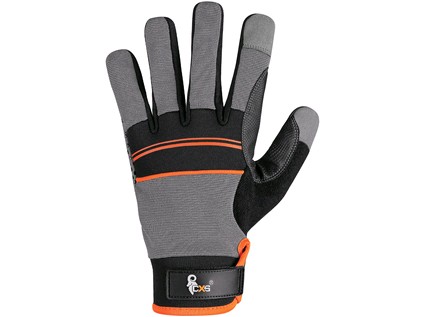Kombinované rukavice se silikonovými aplikacemi v dlani a prstech pro lepší úchop a manipulaci. Dlaň je vyrobena ze syntetické kůže (mikrovlákna), díky které jsou rukavice pohodlné a odolné vůči srážení, natahování a tvrdnutí. Hřbet z prodyšného Span