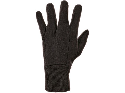 Textilní šitá rukavice ze směsové teplákoviny s našitou pružnou úpletovou manžetou, tmavě hnědé.