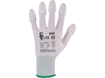 Rukavice s konci prstů máčenými v polyuretanu. Doporučené použití: montáž, kontrola a balení malých součástek v suchém prostředí. Odvětví: automobilový průmysl, elektronika, logistika a skladování.